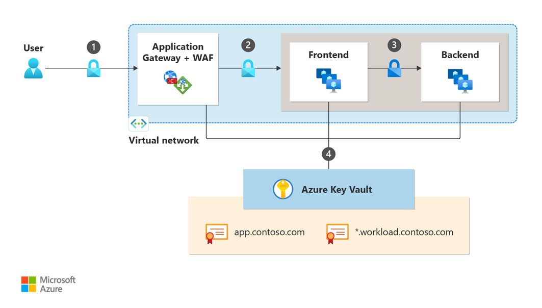 • Data in transit. User traffic between users and the Application Gateway public IP is encrypted using the external certificate. Traffic between the application gateway and the front-end VMs, and between the front-end and back-end VMs is encrypted using an internal certificate. Both certificates are stored in Key Vault: