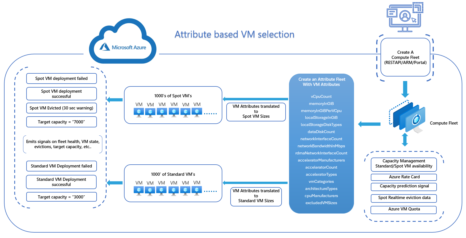 The attribute based virtual machine (VM) selection feature enables you to configure your instance requirements as a set of VM attributes, such as memory, vCPU, and storage. These requirements are matched with all suitable Azure VM sizes, simplifying the creation and maintenance of VM configurations. This feature also allows you to seamlessly utilize newer VM generations as they become available. You also gain access to a wider range of capacity through Azure Spot Virtual Machines. The Compute Fleet service selects and launches VMs that match the specified attributes, eliminating the need to manually choose VM sizes.