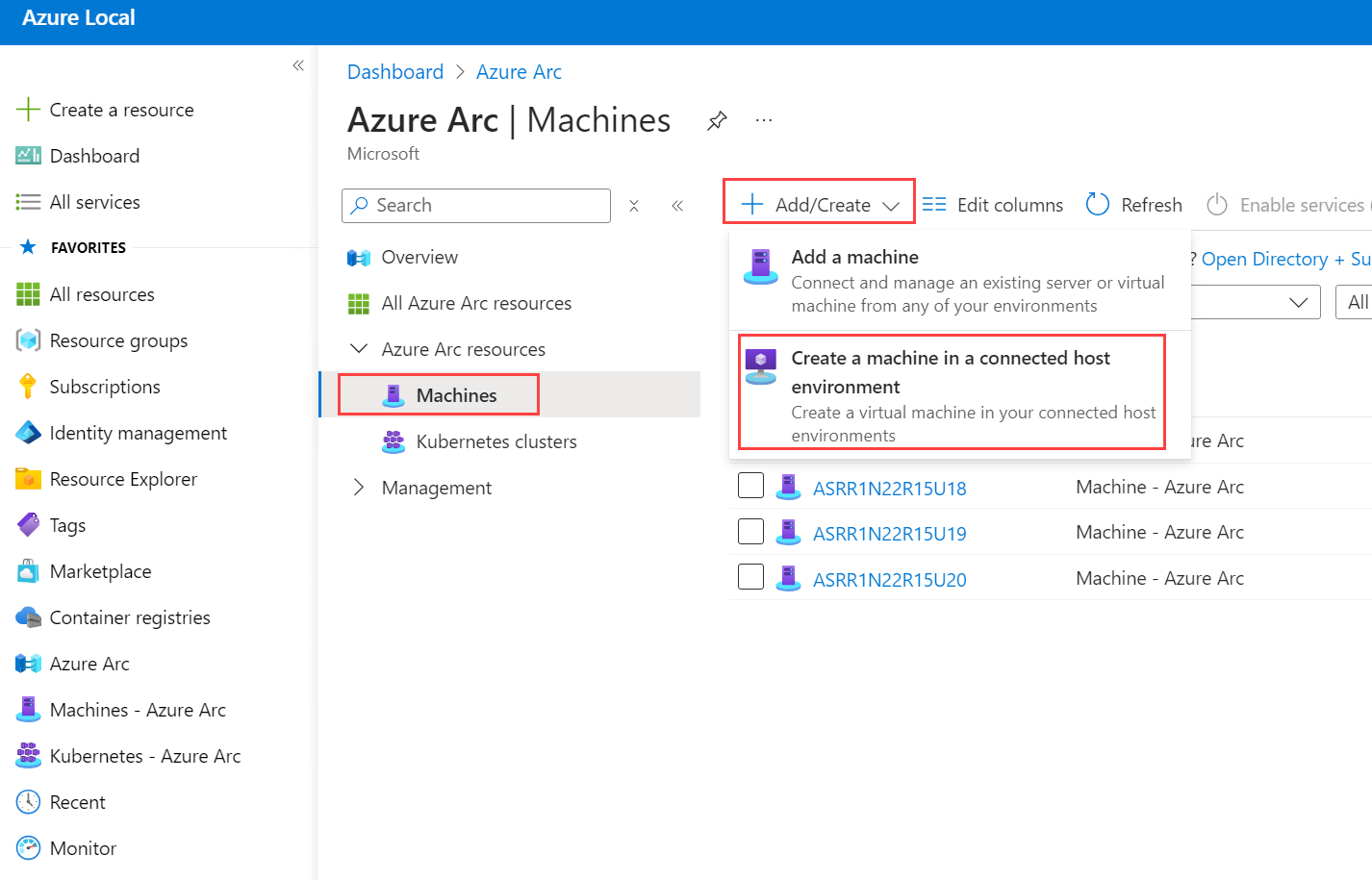 | VM creation | Create a VM in the portal by selecting Azure Arc > Machines > Add/Create > Create a machine in a connected host environment. For more information, see Create Azure Local VMs with disconnected operations (step 7) and Create Azure Local VMs. |
