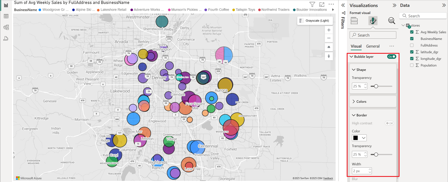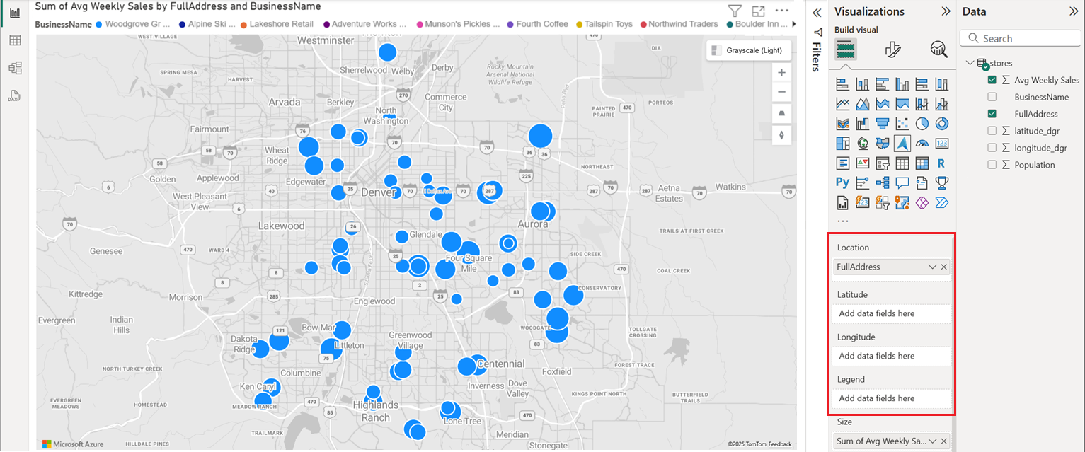 A screenshot of Power BI desktop with the Azure Maps Power BI visual displaying business data.