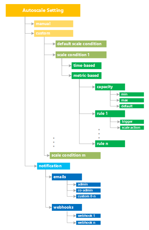 | Scale conditions | profiles | A collection of rules, instance limits, and schedules based on a metric or time. You can define one or more scale conditions or profiles. Define up to 20 profiles per autoscale setting. |