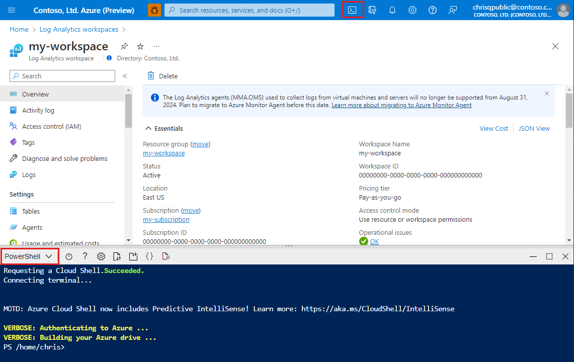 From the Log Analytics workspaces menu, select Tables.