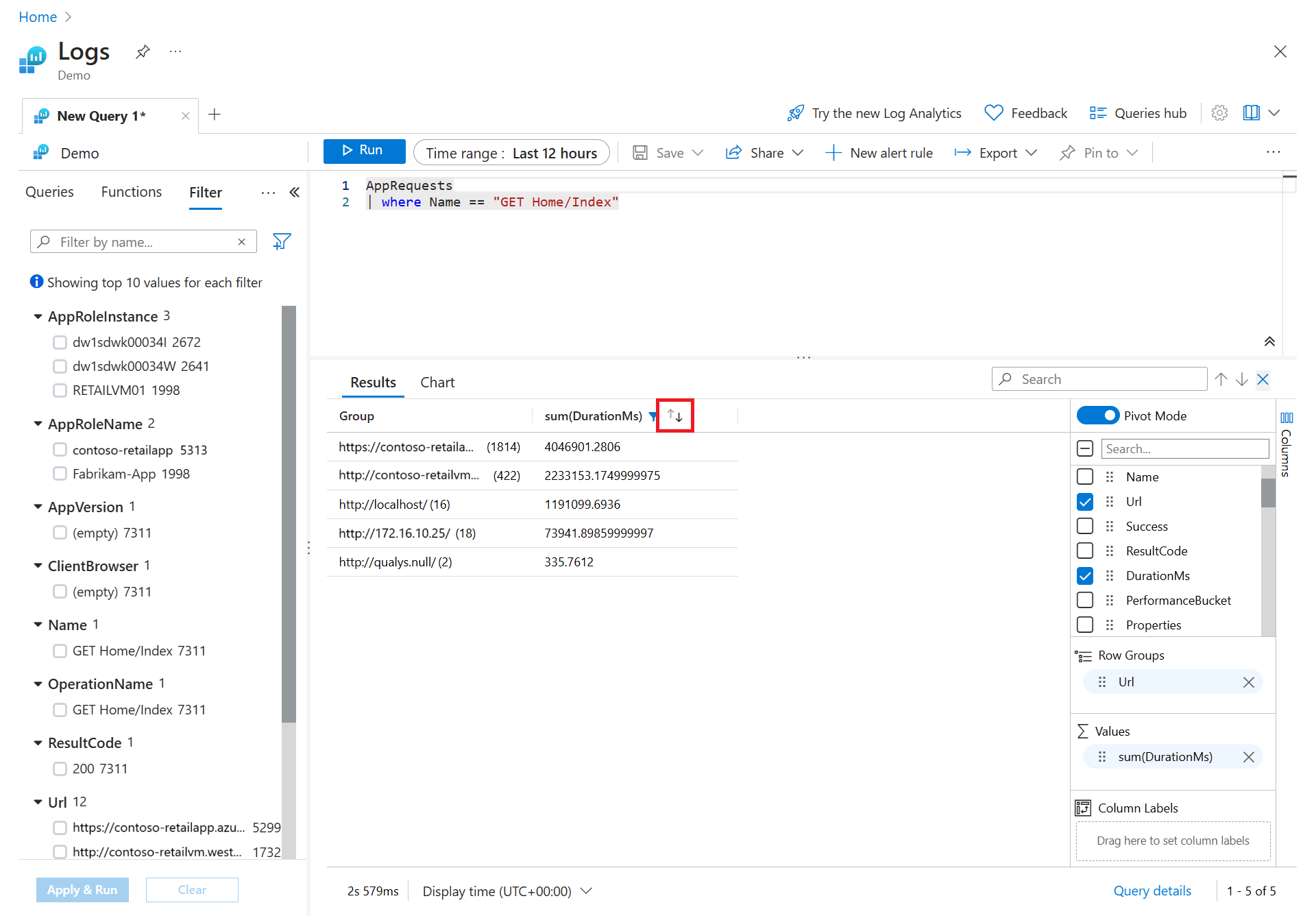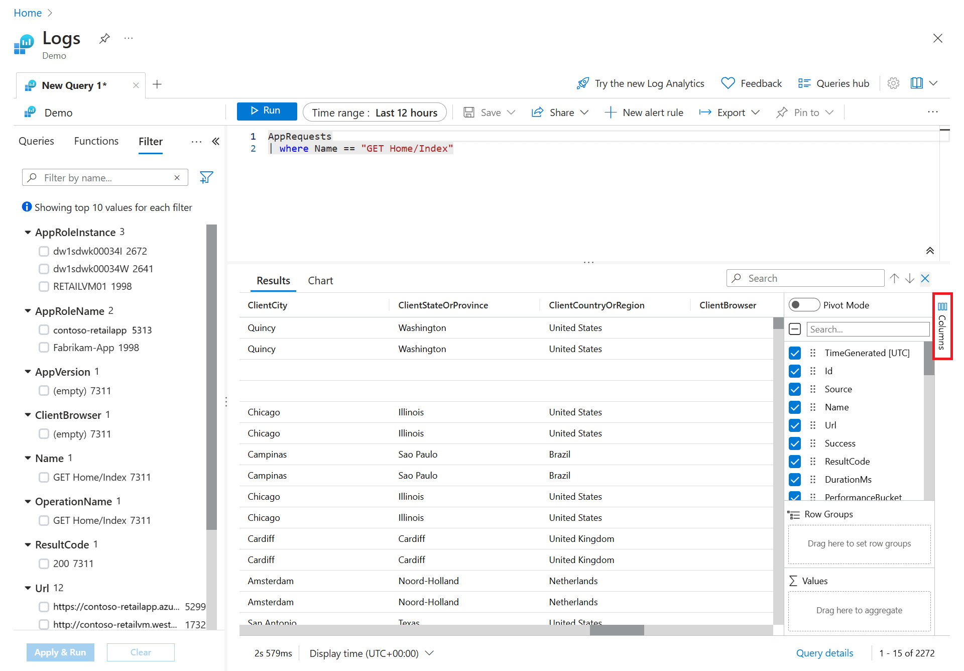 In the sidebar, you see a list of all available columns. Drag the Url column into the Row Groups section. Results are now organized by that column, and you can collapse each group to help you with your analysis. This action is similar to adding a filter condition to the query, but instead of refetching data from the server, you're processing the data your original query returned. When you run the query again, Log Analytics retrieves data based on your original query. Use this method if you want to quickly analyze a set of records as part of interactive analysis.
