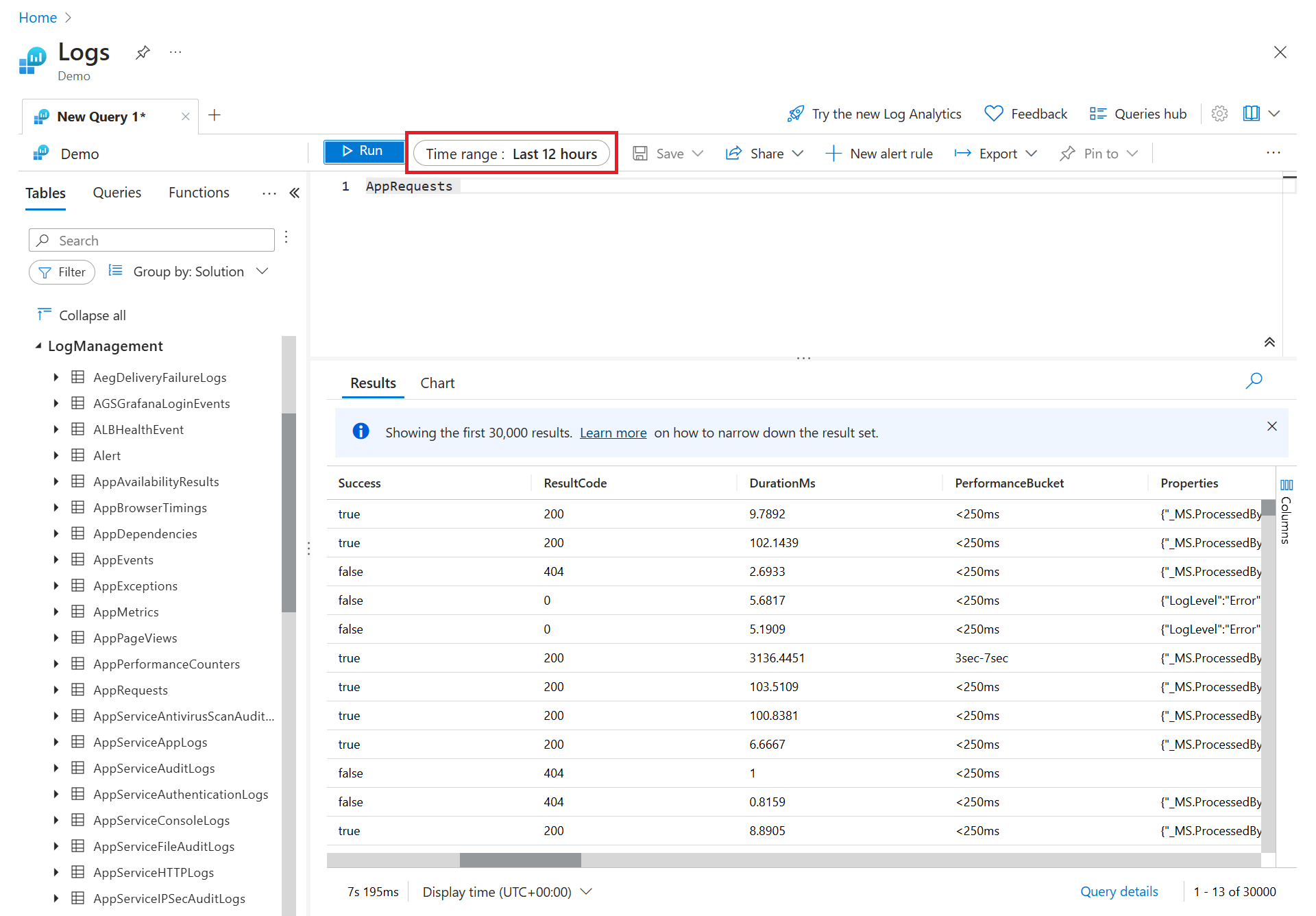 Let's change the time range of the query by selecting Last 12 hours from the Time range dropdown. Select Run to return the results.