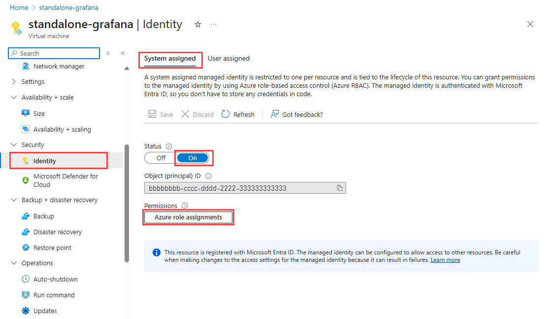 Use the following steps to configure self-managed Grafana on an Azure VM to use Azure-hosted Prometheus data. For this configuration, you must enable a system-assigned managed identity for the VM.