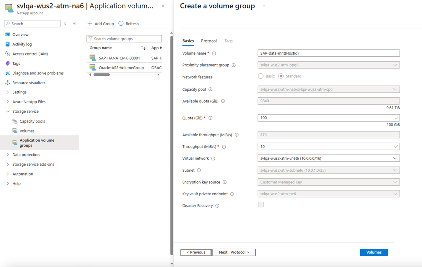 The Volumes tab also shows that only the data, log, and shared volumes are created close to the HANA VMs. The other volumes (data-backup and log-backup) are created at a different location within the region.