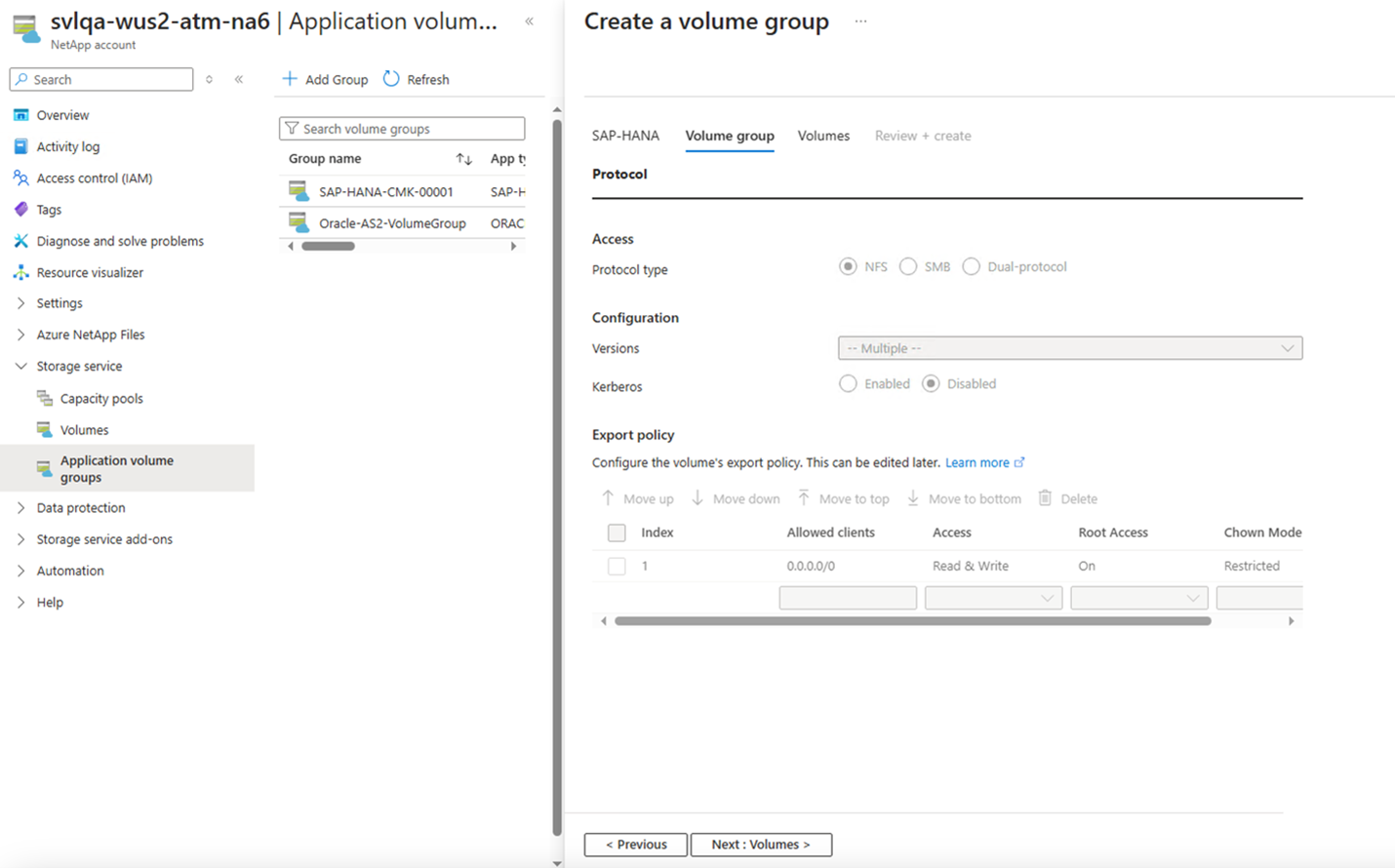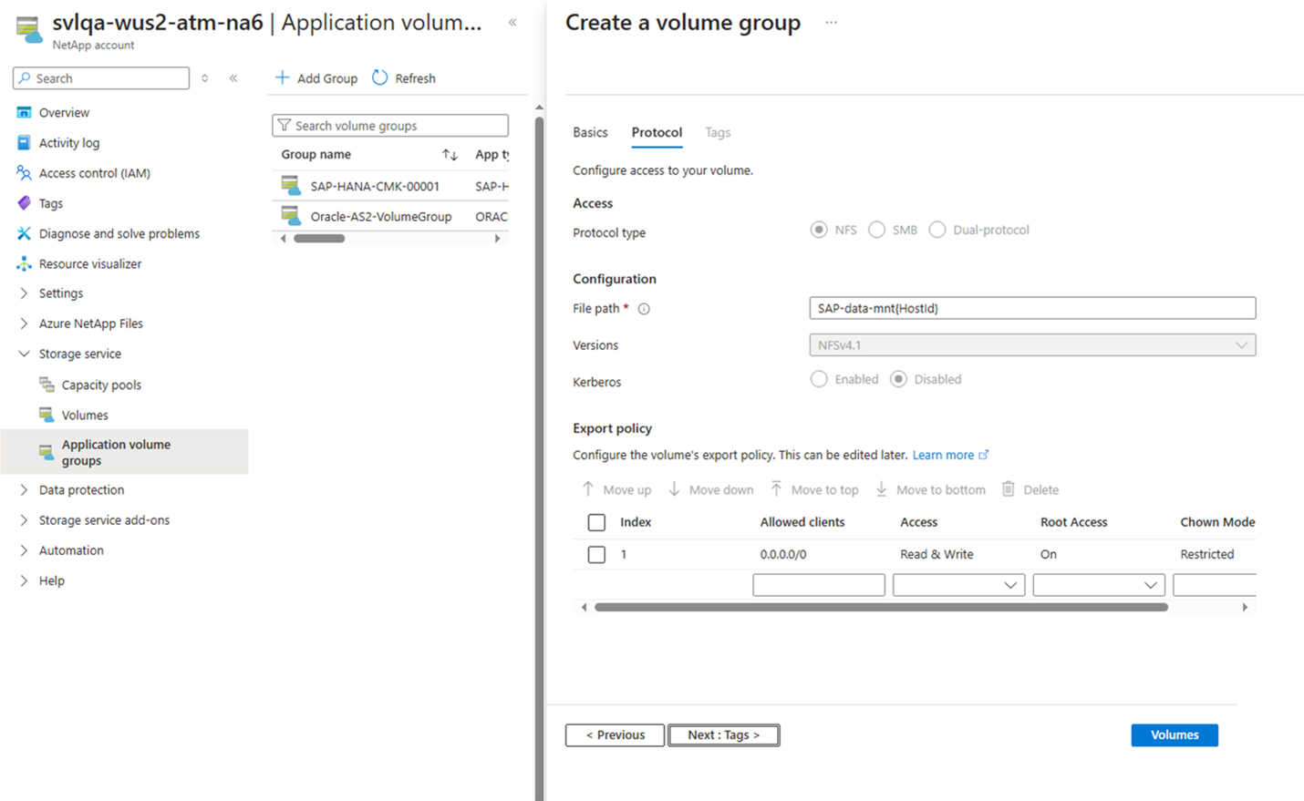 6. In the Protocols section of the Volume Group tab, you can modify the Export Policy, which should be common to all volumes.