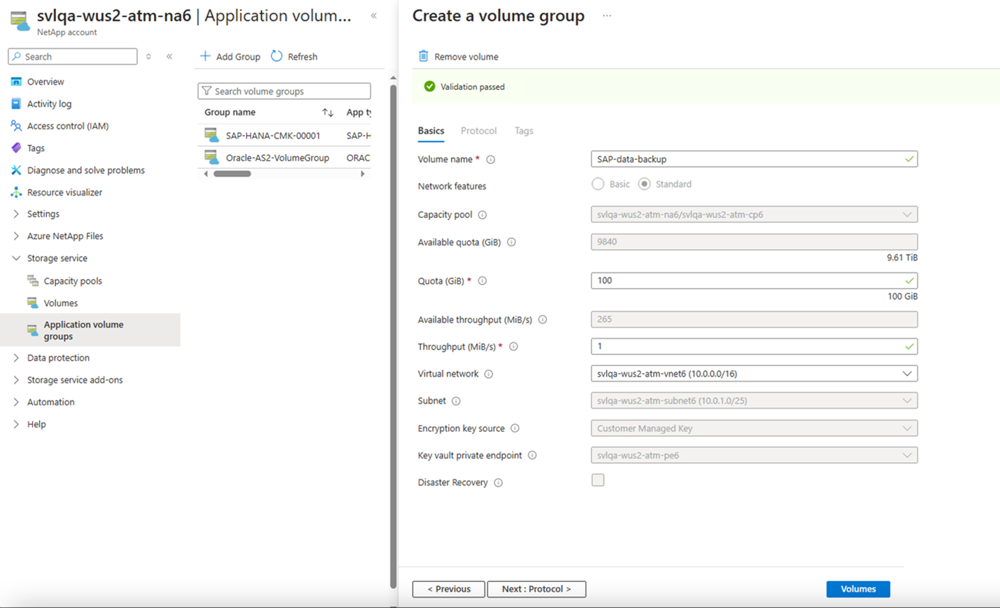 Screenshot that shows the Protocol tab of Create a Volume Group page.