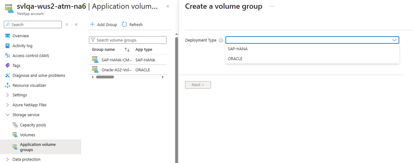 1. From your NetApp account, select Application volume groups, then +Add Group.