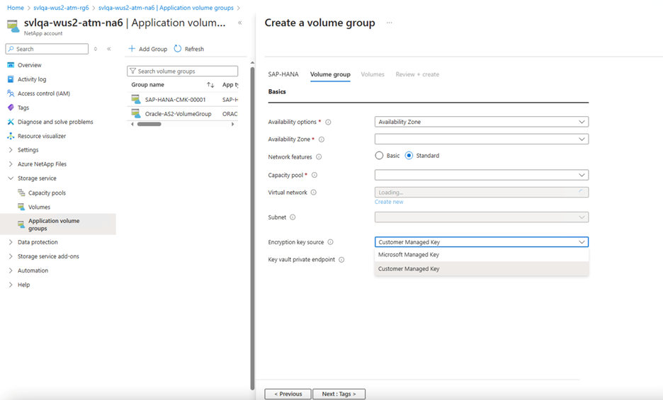 All volumes are placed in a single manual QoS capacity pool. If you want to create the log-backup and data-backup volumes in a separate capacity pool, you can choose not to add those volumes to the volume group.
