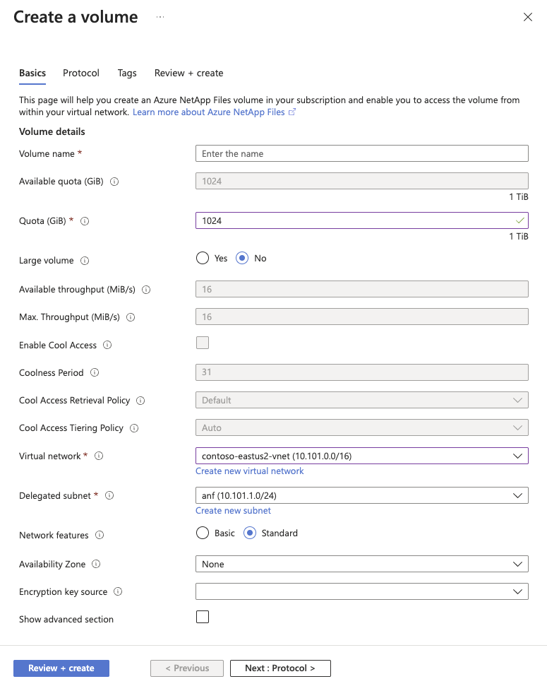 This option lets you deploy the new volume in the logical availability zone that you specify. Select an availability zone where Azure NetApp Files resources are present. For details, see Manage availability zone volume placement.Encryption key source You can select Microsoft Managed Key or Customer Managed Key. See Configure customer-managed keys for Azure NetApp Files volume encryption and Azure NetApp Files double encryption at rest about using this field.