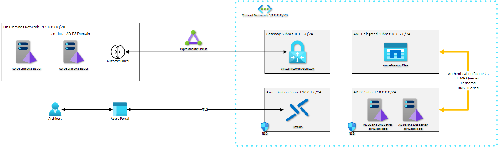 In the sample network topology, an on-premises AD DS domain (anf.local) is extended into an Azure virtual network. The on-premises network is connected to the Azure virtual network using an Azure ExpressRoute circuit.