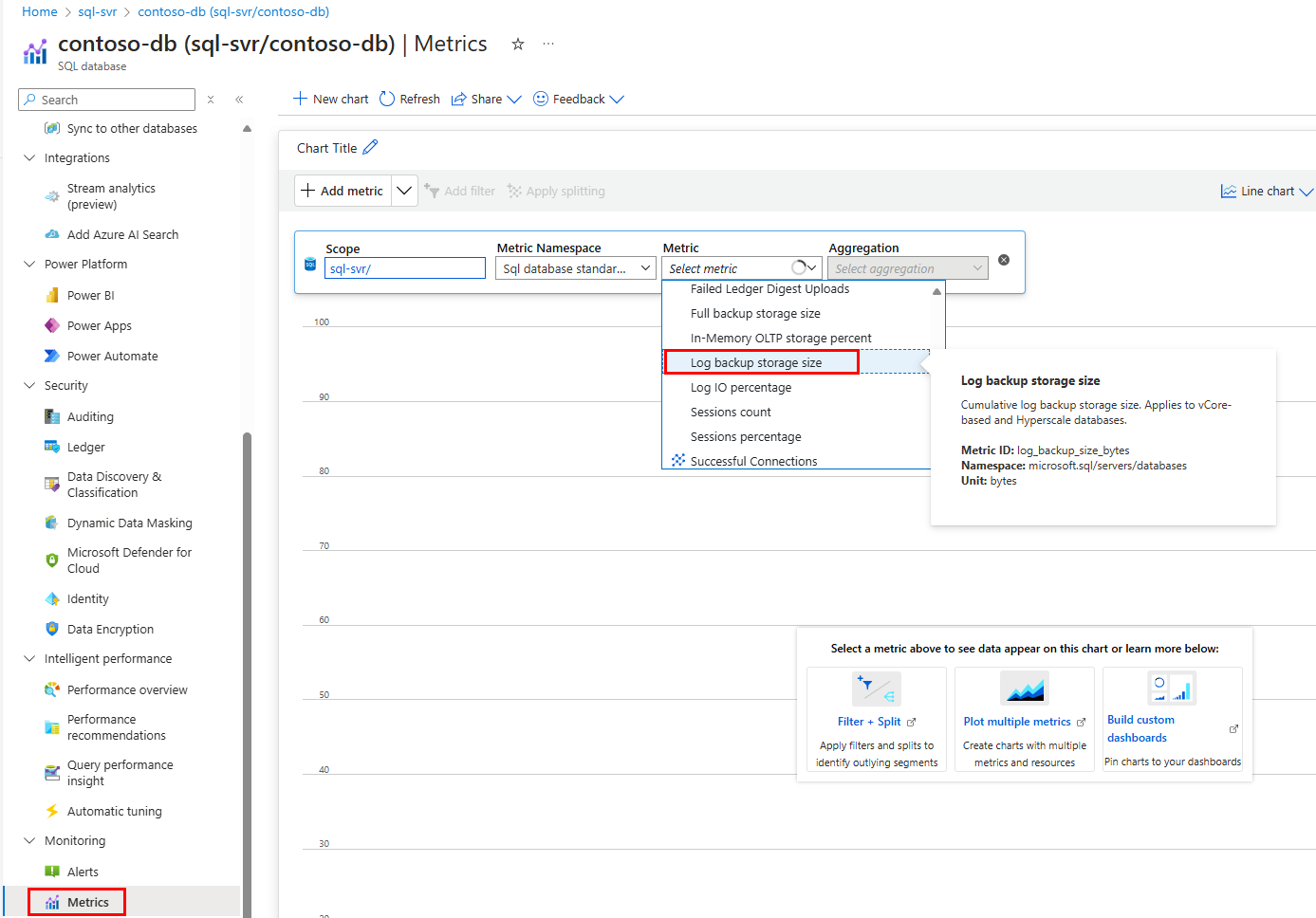 You can monitor total backup storage consumption for each backup type (full, differential, transaction log) over time, as described in Monitor consumption.