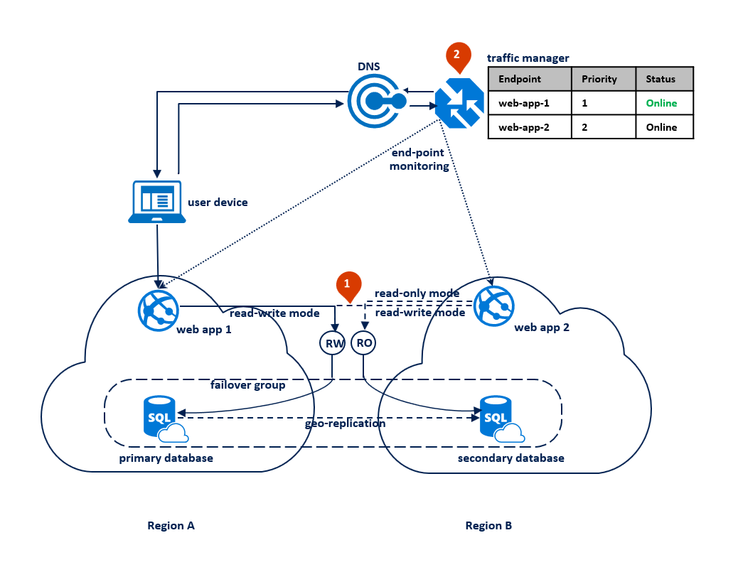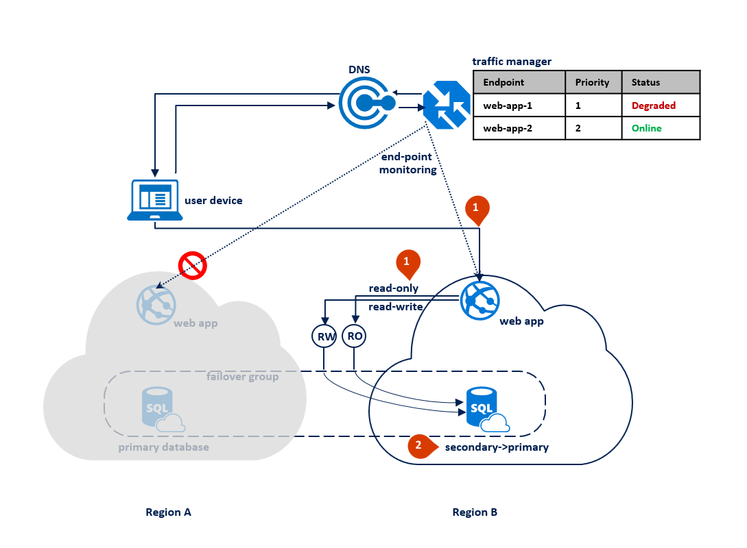 When Traffic Manager detects a connectivity failure to region A, it automatically switches user traffic to the application instance in region B. With this pattern, it is important that you set the grace period with data loss to a sufficiently high value, for example 24 hours. It ensures that data loss is prevented if the outage is mitigated within that time. When the web application in region B is activated the read-write operations start failing. At that point, it should switch to the read-only mode (1). In this mode the requests are automatically routed to the secondary database. If the outage is caused by a catastrophic failure, most likely it cannot be mitigated within the grace period. When it expires the failover group triggers the failover. After that the read-write listener becomes available and the connections to it stop failing (2). The following diagram illustrates the two stages of the recovery process.