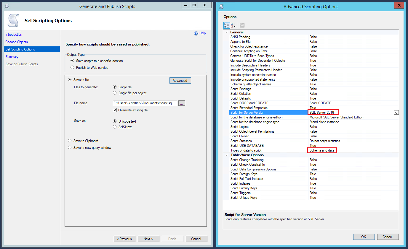 Ensure you select the correct options when you script such items as the target version, dependent objects, and advanced options.