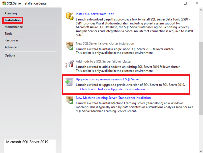 3. The Installation Wizard starts the SQL Server Installation Center. To upgrade an existing instance of SQL Server, select Installation on the navigation pane, and then select Upgrade from an earlier version of SQL Server.