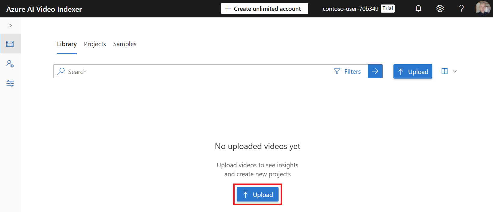 - Select the Library tab. Your indexed videos appear there. If your video is still uploading, you see a thumbnail with the upload percentage.