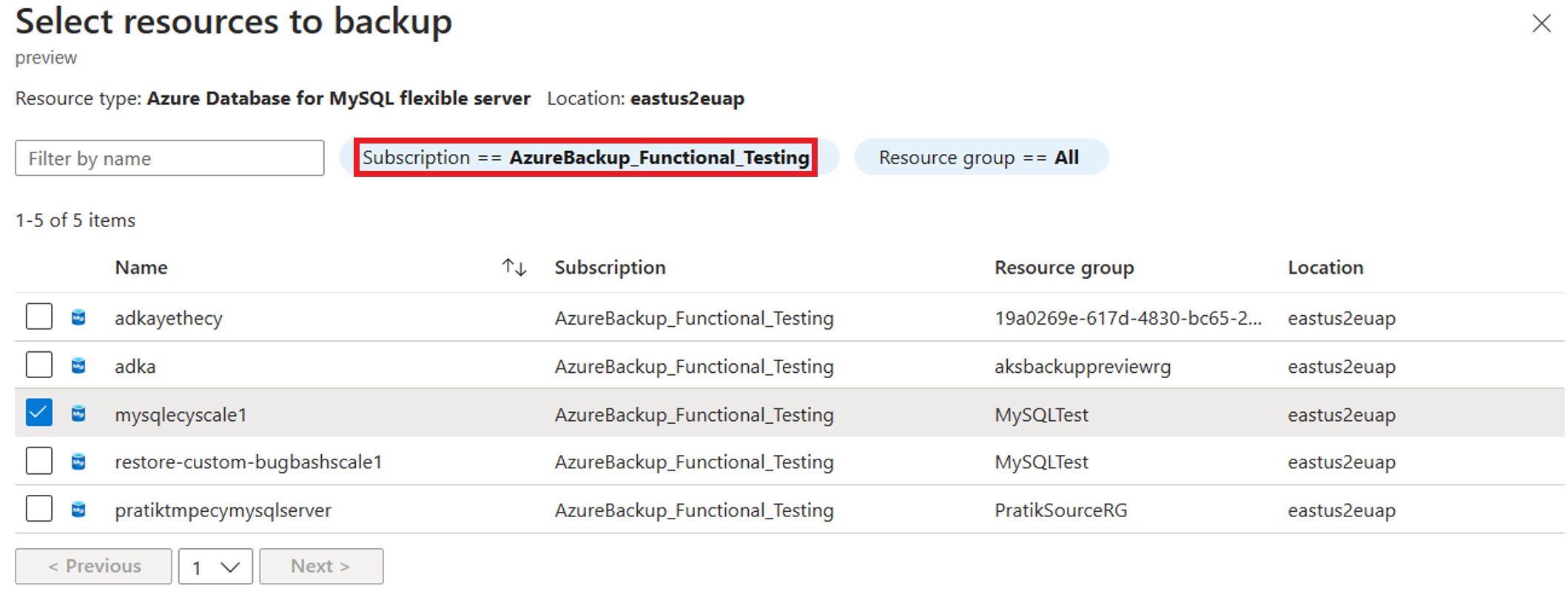 Select the Azure Database for MySQL - Flexible Server instance to back up.