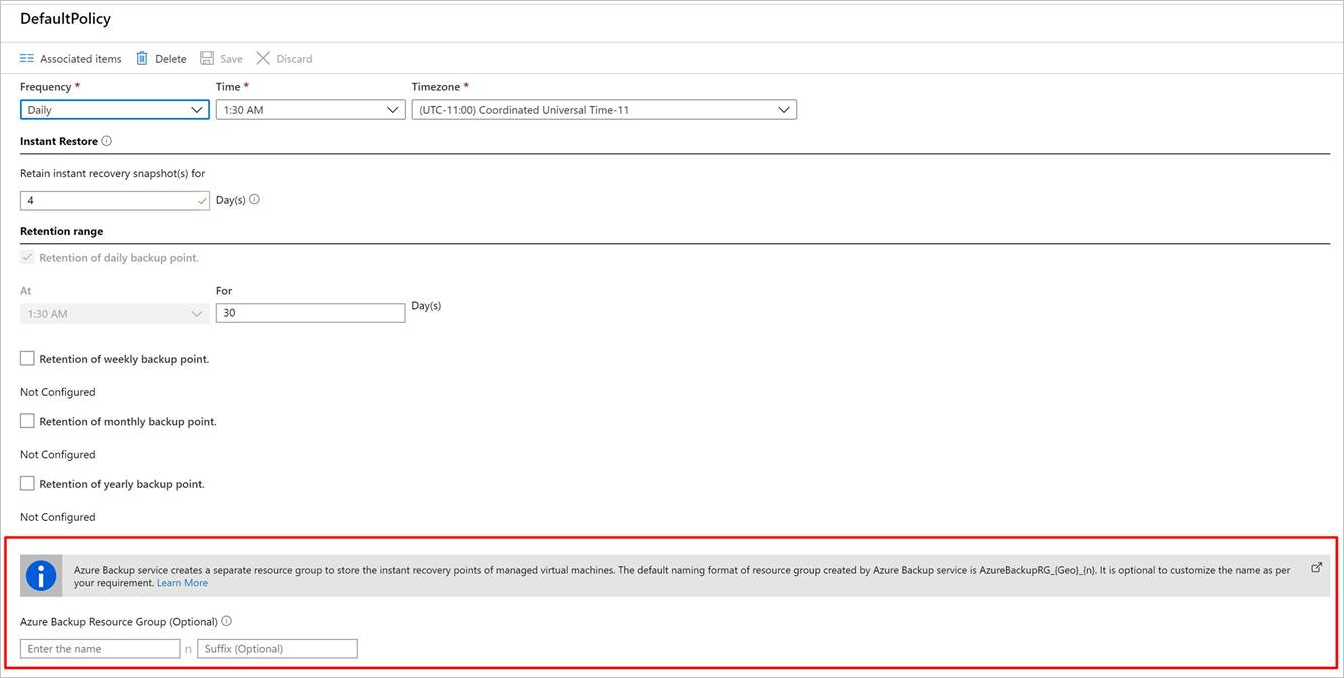 Azure Backup creates a separate resource group, different than the resource group of the VM, to store the restore point collection (RPC). The RPC houses the instant recovery points of managed VMs. The default naming format of the resource group created by Azure Backup is AzureBackupRG_<Geo>_<number>. An example is AzureBackupRG_northeurope_1. You can now customize the resource group name that Azure Backup created.