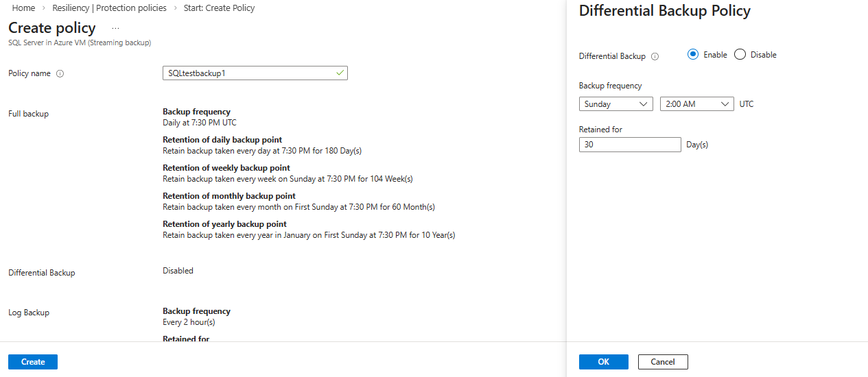 8. On the Create policy pane, to modify the default settings, select the Edit link corresponding to Differential backup.