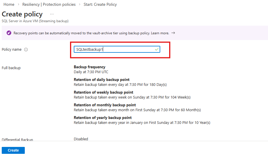 1. Go to Resiliency, and then select Manage > Protection policies > + Create policy > Create backup policy.