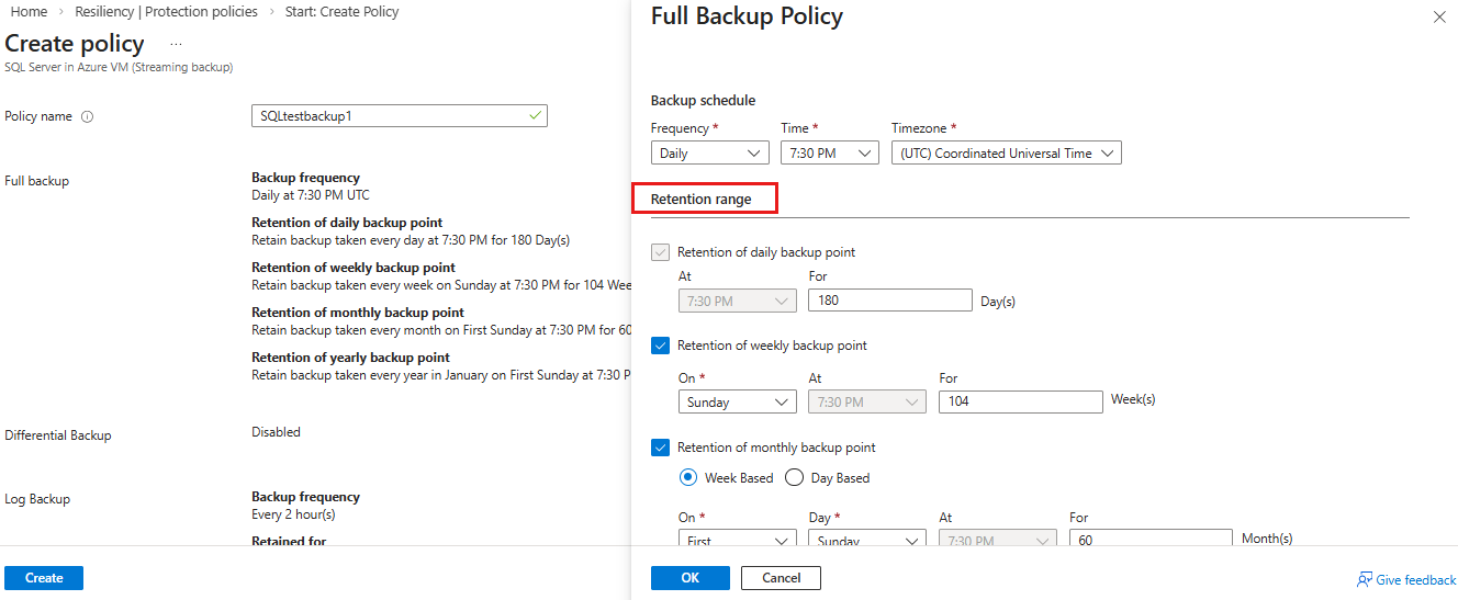 • The differential backup retention period can't be greater than that of the full backup (as the differential backups are dependent on the full backups for recovery).