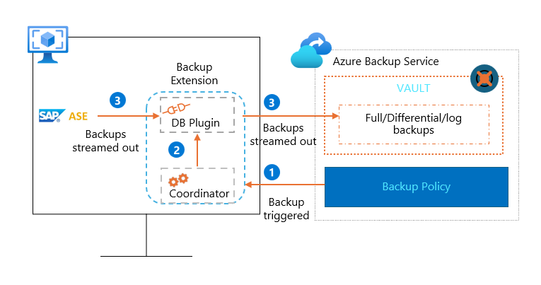 • The Azure Backup plugin for ASE maintains all the backup schedules and policy details. It triggers the scheduled backups and communicates with the ASE backup engine through the APIs.