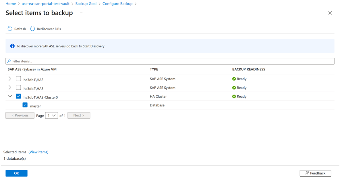 • The Azure VM that's running the SAP ASE server is registered with the vault, and the databases to be backed up are discovered. To enable the Azure Backup service to discover databases, a preregistration script must be run on the ASE server as a root user.