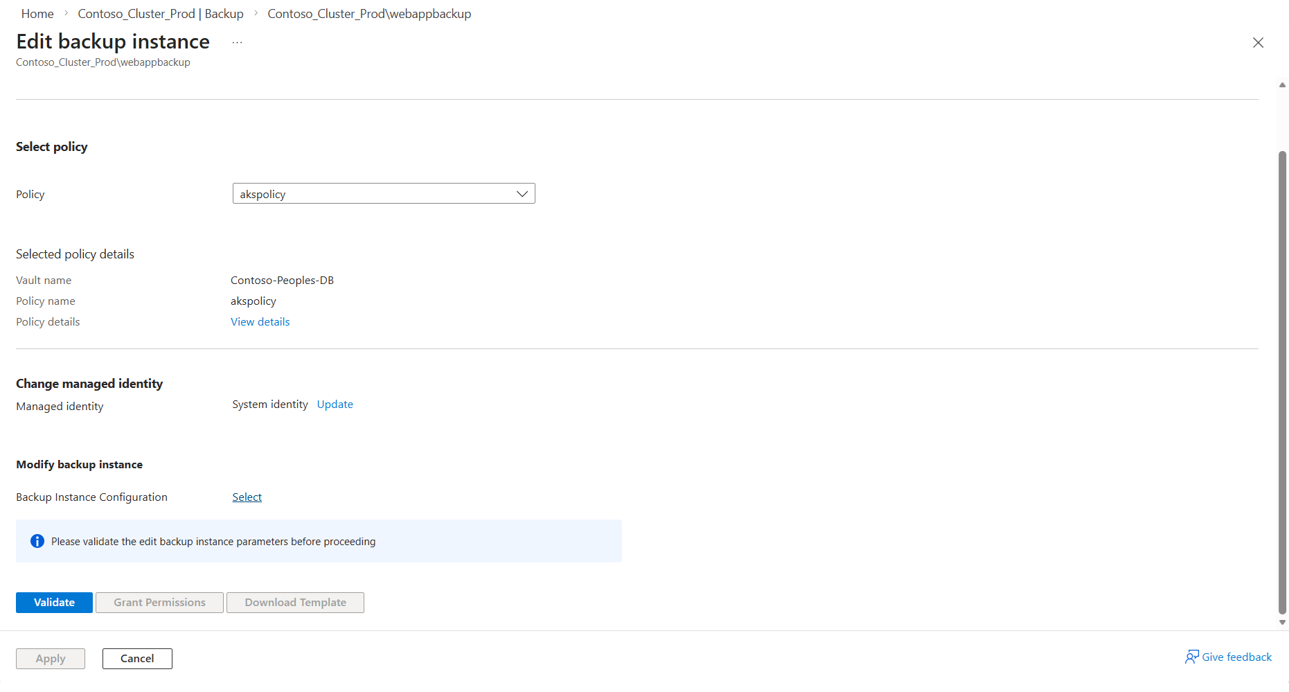 Find your AKS cluster backup instance, open it and click on Edit backup instance on top.