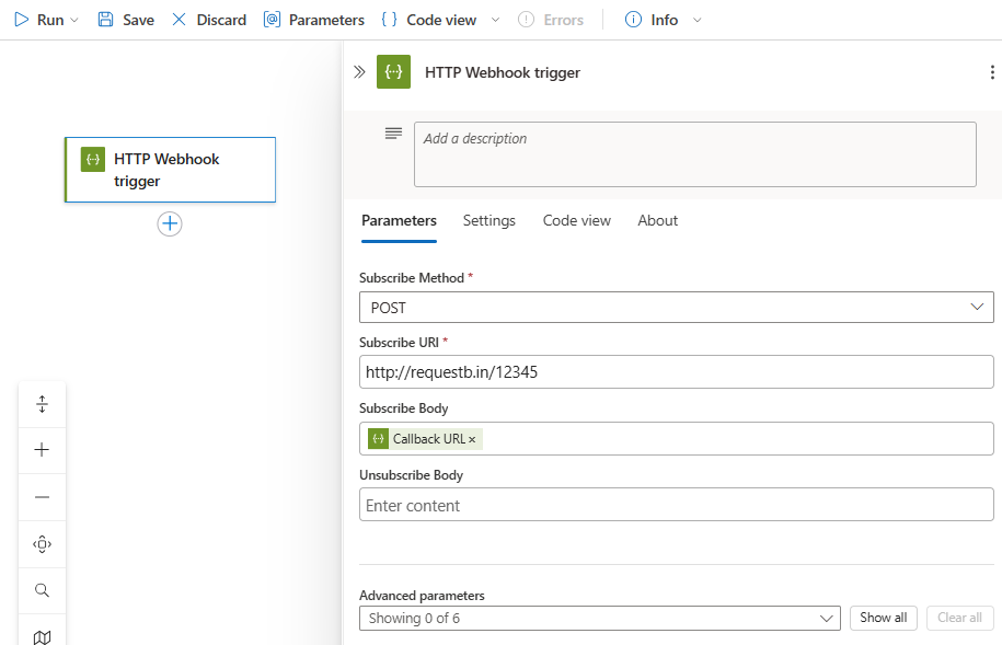 Property Required Description Subscribe Method Yes The method to use when subscribing to the target endpoint Subscribe URI Yes The URL to use for subscribing to the target endpoint Subscribe Body No Any message body to include in the subscribe request. This example includes the callback URL that uniquely identifies the subscriber, which is your logic app, by using the @listCallbackUrl()expression to retrieve your logic app's callback URL.Unsubscribe Body No An optional message body to include in the unsubscribe request