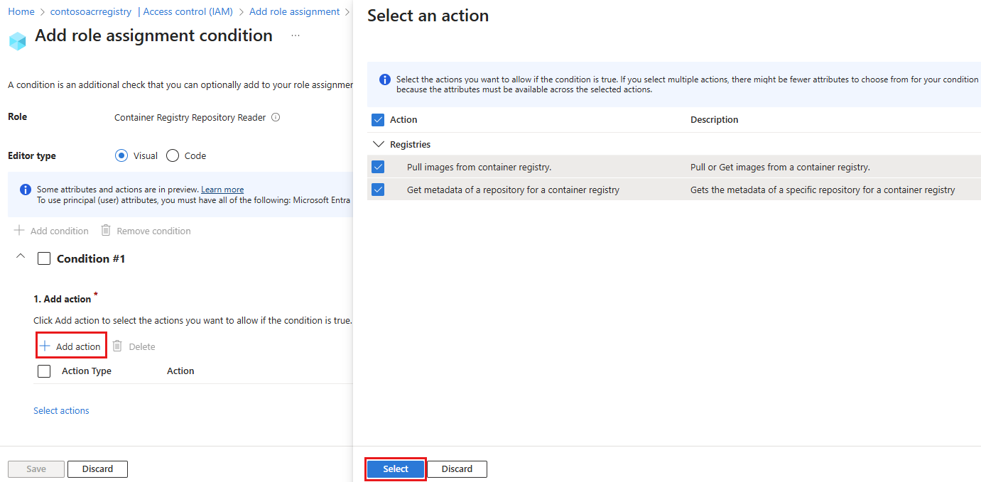 Under Condition #1, select the actions (permissions) belonging to this role that you want to grant in this repository-scoped role assignment. In most cases, select all actions to limit all actions performed by identities with this role to the repository scope. Choose Select to save your changes.