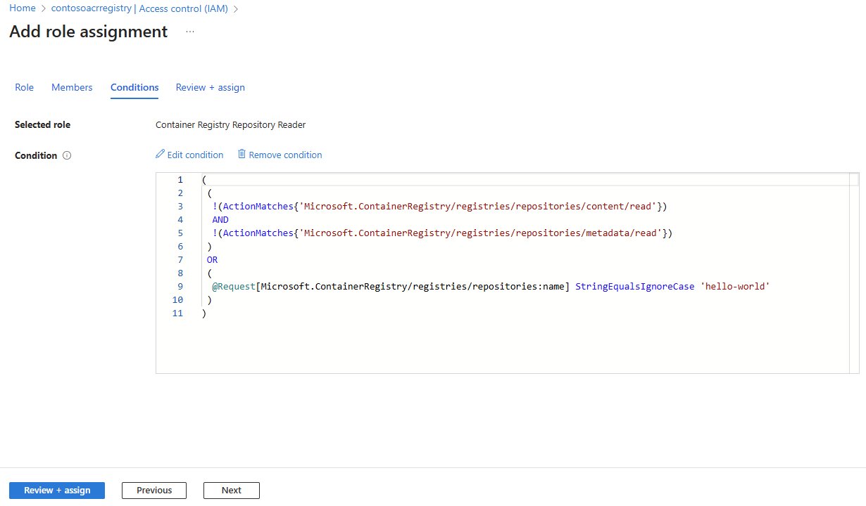 This example assigns the Container Registry Repository Reader role to grant pull permissions to a single repository. By adding ABAC conditions, the role assignment lets the identity pull images, view tags, and read metadata only from the specified repository, preventing access to other repositories in the registry.