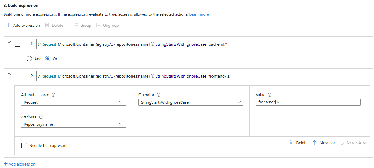 /is required in theValuefield for the expression of the ABAC condition. If you don't include the trailing slash/, you might unintentionally grant permissions to other repositories that don't match the prefix. For example, if you enterbackendwithout the trailing slash/, the role assignment grants permissions to all repositories with the prefixbackend, such asbackend/nginx,backend/redis,backend-infra/k8s,backend-backup/store,backend, andbackendsvc/containers.
