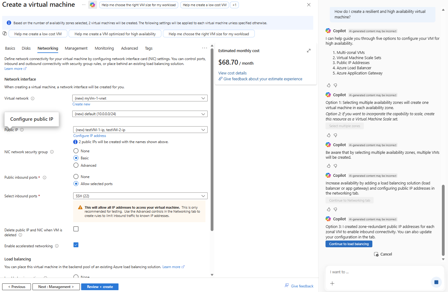 Azure Copilot can provide additional context to help you create high-availability VMs. It can help you create VNs in availability zones, decide whether a Virtual Machine Scale Set is the right option for your needs, or assess which networking resources will help manage traffic effectively across your compute resources.