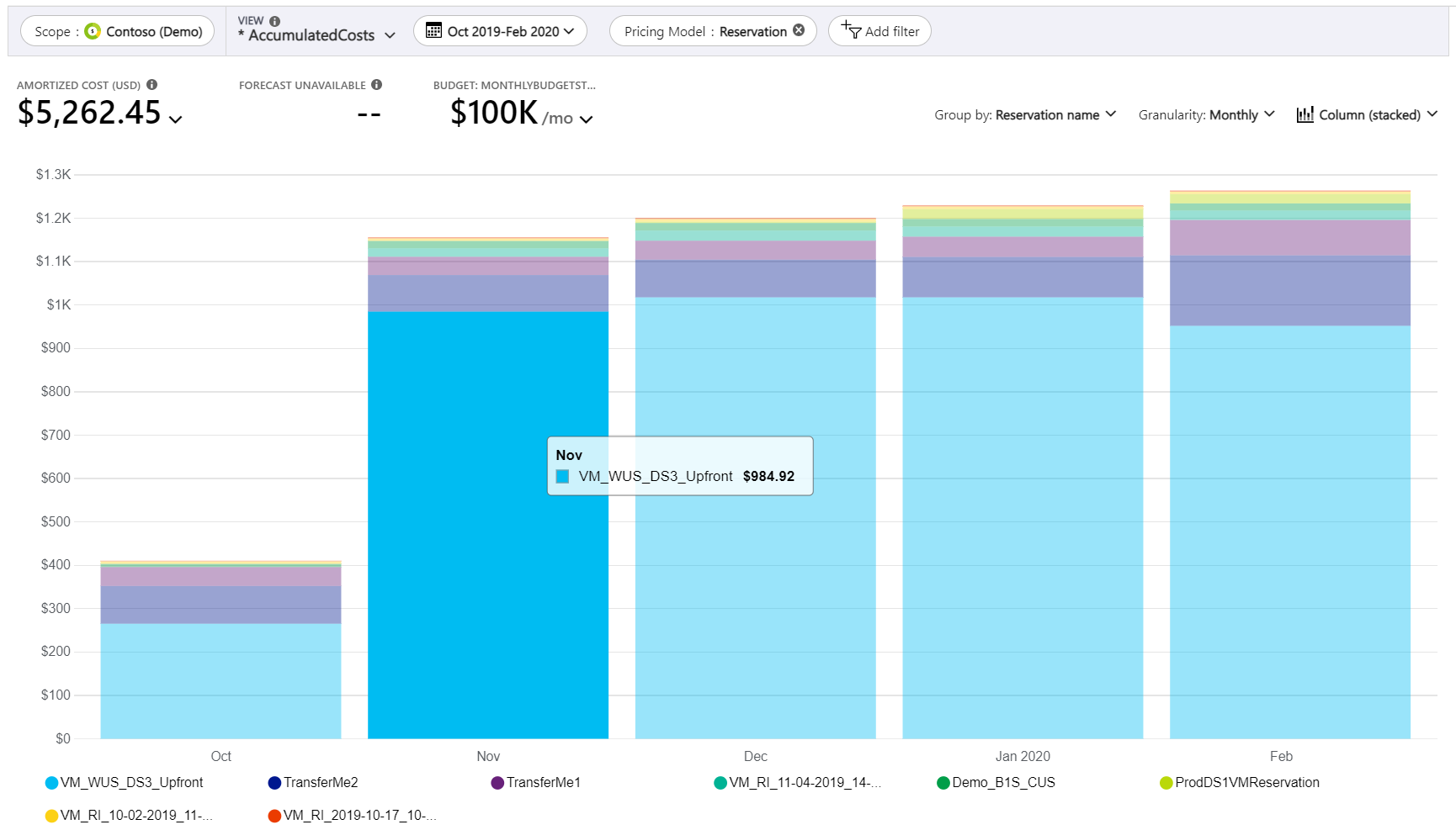 - Next, change the Granularity to Monthly and expand the date range. The following example shows varying monthly costs for reservations. The cost varies because the number of days in each month differs. November has 30 days, so the daily cost of $32.83 * 30 = ~$984.90.