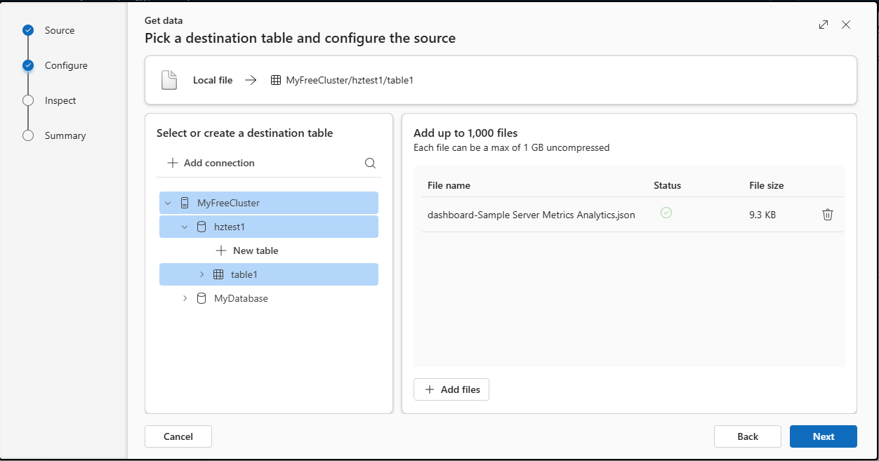 Select a target database and table. To ingest data into a new table, select + New table and enter a table name.