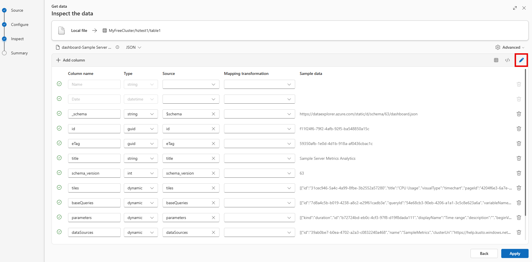 Some data format mappings (Parquet, JSON, and Avro) support simple ingest-time transformations. To apply mapping transformations, create or update a column in the Edit columns window.