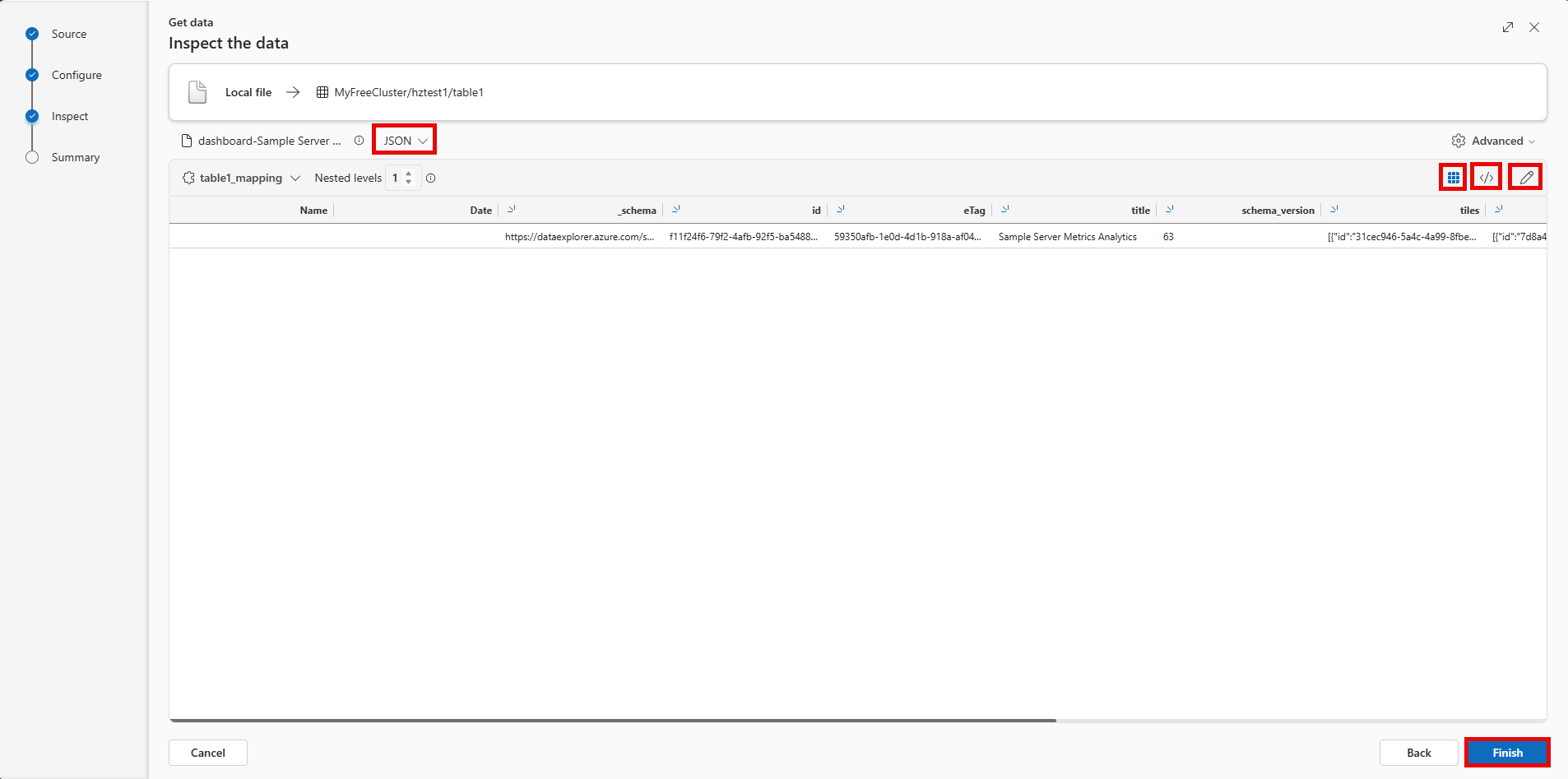 - Change the automatically inferred data format by selecting the desired format from the dropdown. See Data formats supported by Azure Data Explorer for ingestion.