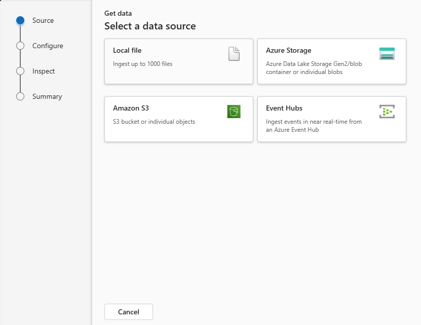 Select the data source from the available list. In this example, you're ingesting data from a Local file.