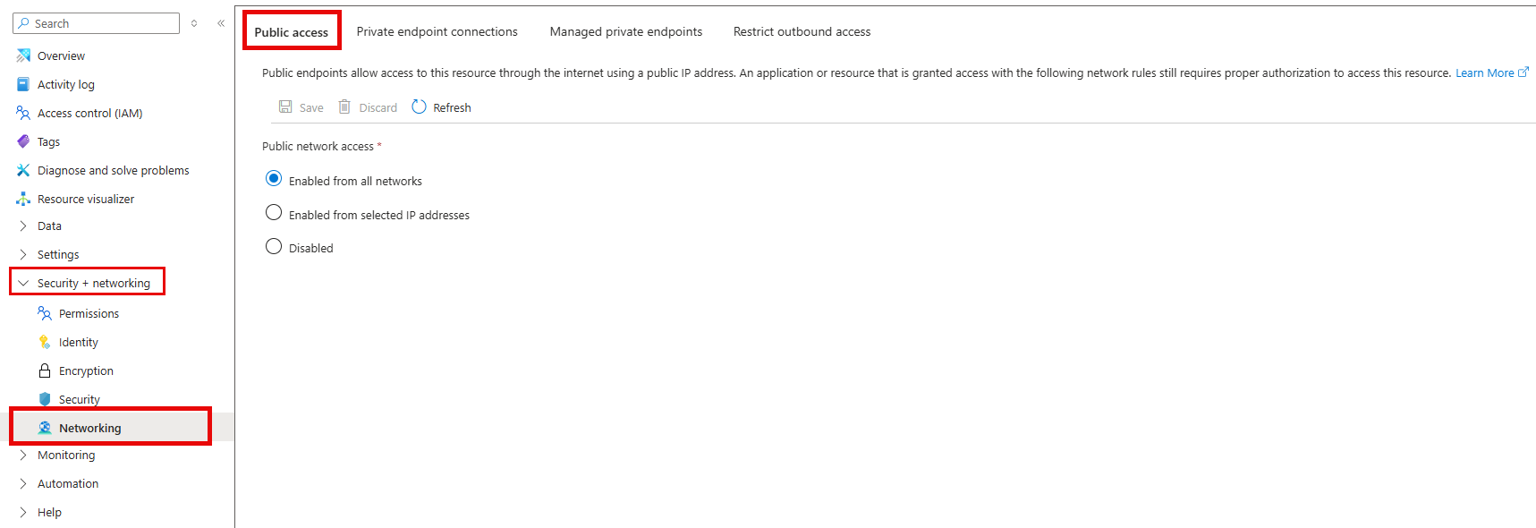 From the left-hand menu, under Security + Networking, select Networking. If you select the Enabled from selected IP addresses option, you must specify the IP address or CIDR using the IPv4 address format.