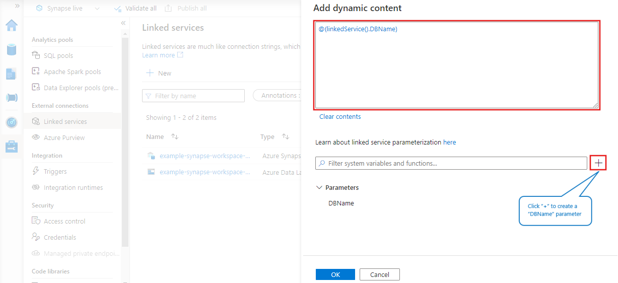 Natively supported in UI: When authoring linked service on UI, the service provides built-in parameterization experience for the following types of linked services. In linked service creation/edit blade, you can find options to new parameters and add dynamic content. Refer to UI experience.
