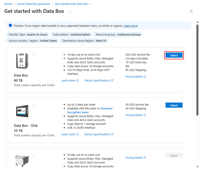 - Your Azure subscription doesn't support the Data Box product. In some cases, your subscription might not support a Data Box product in a specific country/region.