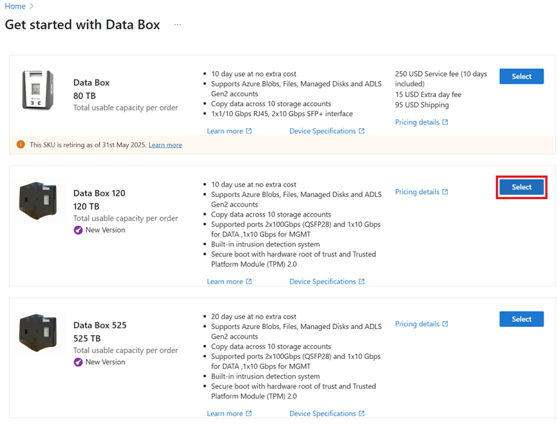 Select the Data Box Next Gen product to order, either Data Box 120, as shown in the provided example, or Data Box 525.