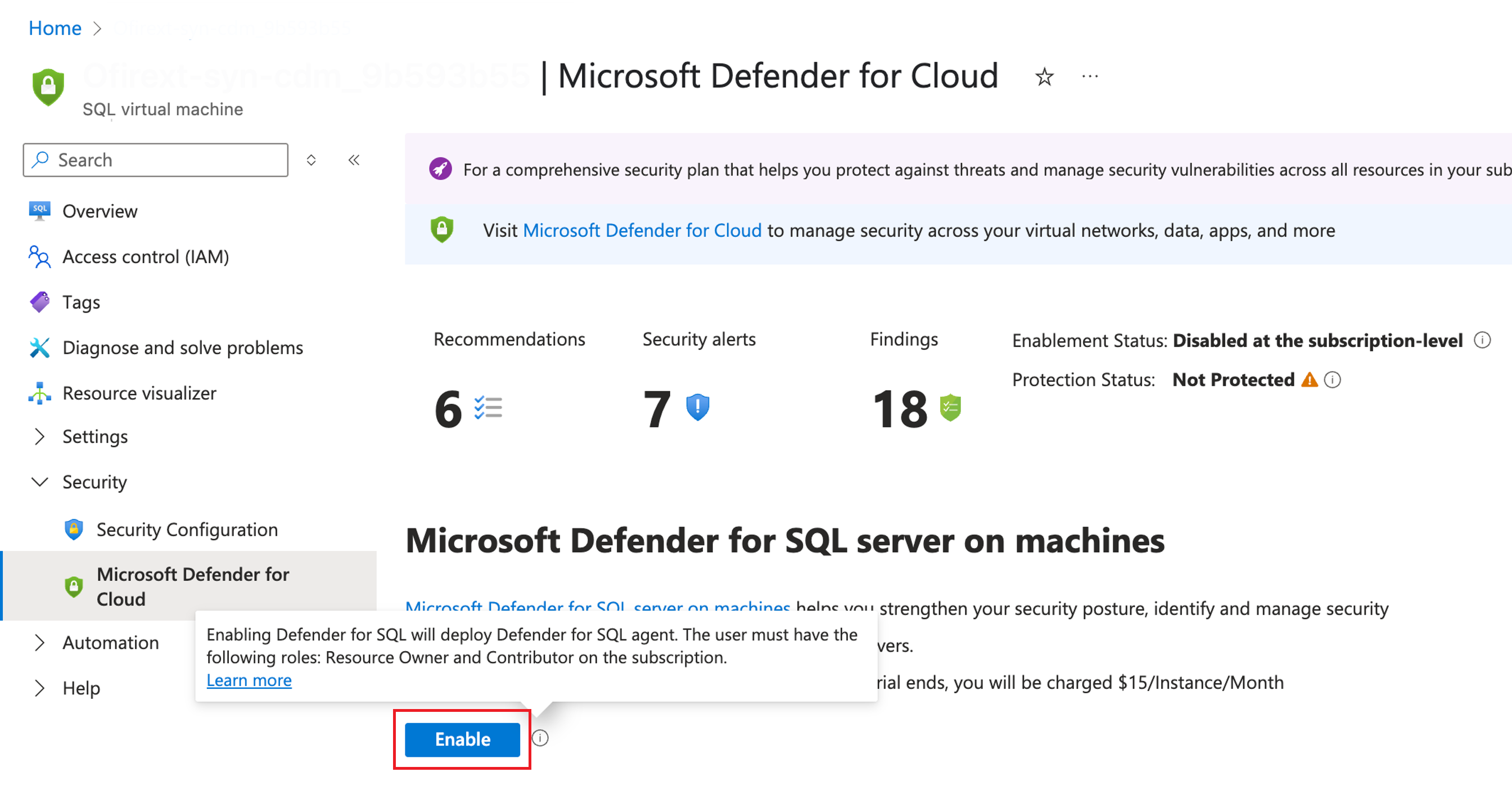 Select Enable Microsoft Defender for SQL servers on Machines.