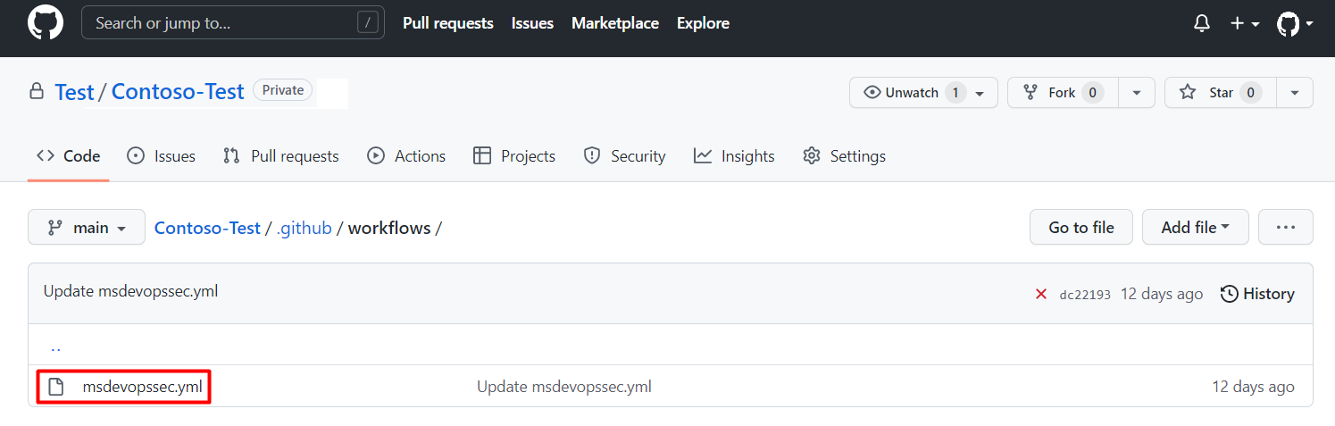 Screenshot that shows you where on the screen to select the msdevopssec.yml file.