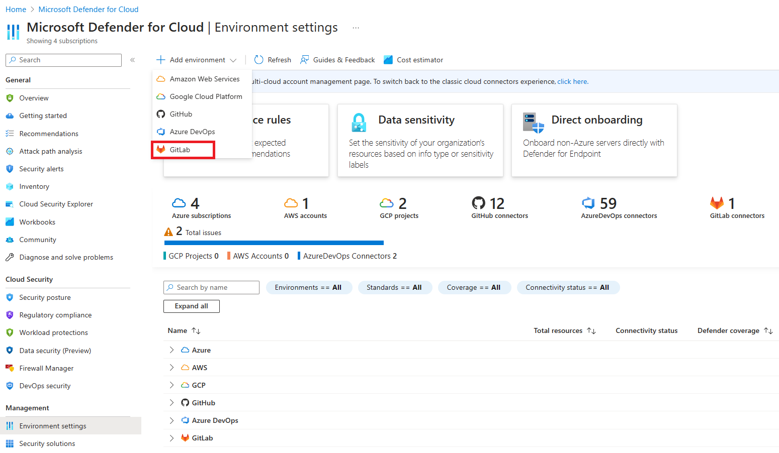 In this quickstart, you connect your GitLab groups on the Environment settings page in Microsoft Defender for Cloud. This page provides a simple onboarding experience to automatically discover your GitLab resources.