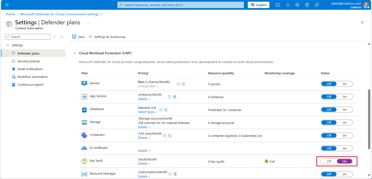 On the Defender plans page, toggle the Key Vault plan to On.