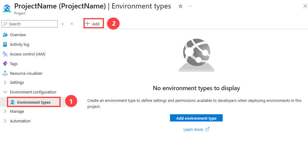 2. In the left menu, under Environment configuration, select Environment types. Select Add at the top of the pane.