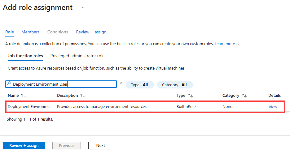 Before developers can create environments based on the environment types in a project, you must provide access for them via a role assignment at the level of the project. The Deployment Environments User role enables users to create, manage, and delete their own environments. You must have sufficient permissions to a project before you can add users to it.