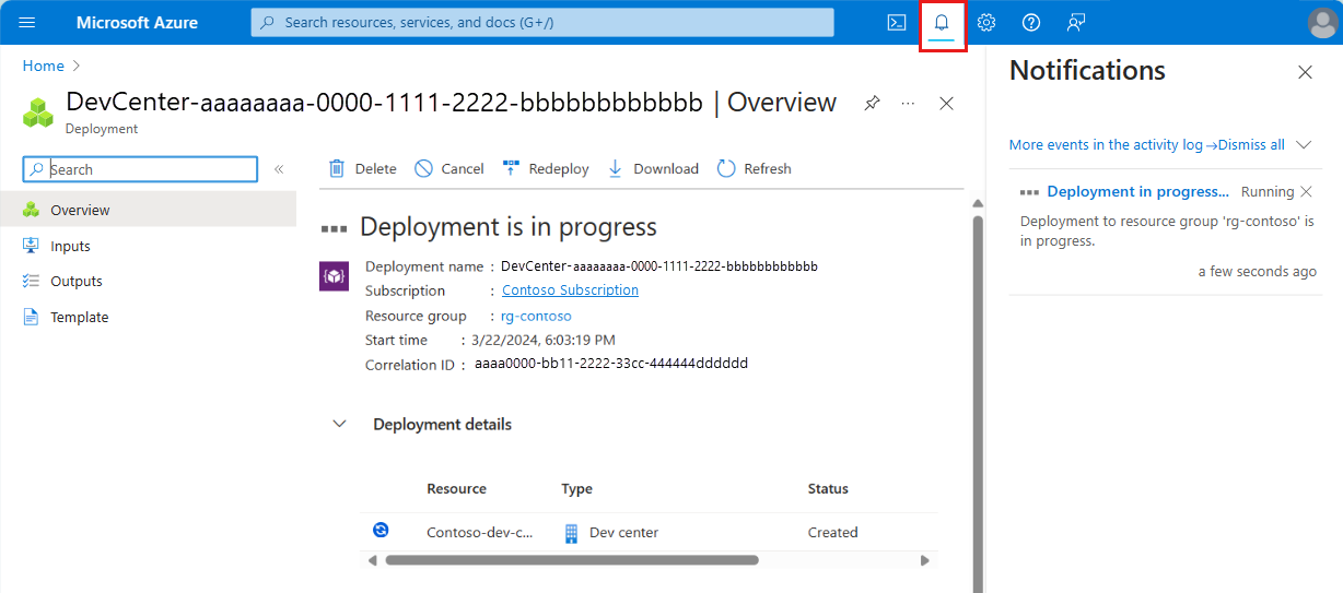 Screenshot that shows portal notifications to confirm the creation of a dev center.